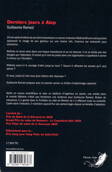 Présentation25 ans après le décès de son père emporté par un cancer, le docteur Mathias Brunel croit pourtant apercevoir le visage de son géniteur sur une chaîne info. L’homme est recherché pour terrorisme… Mathias se lance alors dans une traque hasardeuse et sa vie bascule. Il ne se doute pas des dangers qui l’attendent. D’autant qu’il met les pieds dans une organisation s’apprêtant à semer la terreur sur l’Occident… Mathias aura-t-il le courage d’aller jusqu’au bout ? Saura-t-il affronter les secrets qu’il veut percer ? Et vous, jusqu’où iriez-vous pour obtenir des réponses ? Guillaume Ramezi propose avec ce premier roman un thriller d’espionnage captivant. Lauréat du : Prix du Balais de la Découverte 2018. Grand prix du salon de Nemours - Le Coquelicot Noir 2019. Prix Polar du salon de la Saussaye 2019. Sélectionné pour le Prix Sang pour sang polar de Saint-Chef (2e place). Afficher moinsAfficher plus