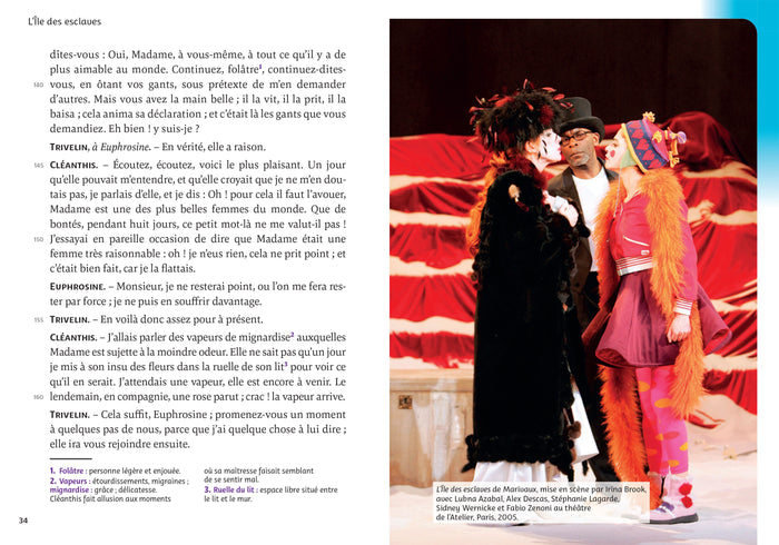PrésentationLa pièce de Marivaux sur les rapports«  maîtres-valets » dans uneéditiontout en couleurs,adaptéeà tous les profils de lecteurset enrichie de nombreux outils pédagogiques. En  lien avec les objets d’étude«  Individu et société : confrontations de valeurs » (4e) et«  Dénoncer les travers de la société » (3e).   Le texte Après leur naufrage, Iphicrate et Euphrosine, accompagnés de leurs valets Arlequin et Cléanthis, se retrouvent sur uneîle où règne uneétrange loi. Le temps de leur séjour, les maîtres sont ainsi contraints– pour se guérir de leur orgueil– d’échanger leur rôle avec leurs serviteurs. De cette inversion naît une comédie satirique au rythme enlevé, qui nous inviteà réfléchir sur les rapports de domination sociale.   La citation «  Vous avezété leurs maîtres, et vous en avez mal agi ; ils sont devenus les vôtres, et ils vous pardonnent ; faites vos réflexions là-dessus. » (Trivelin dansL’Île des esclaves)   Les outils pédagogiques dans l’ouvrage • un  avant-texte pour  préparer la  lecture • des  lectures actives au fil du texte • des repères sur le théâtre au XVIIIesiècle et sur l’utopie • un parcours de lecture analytique en 7étapes • des ateliers interdisciplinaires (mime, mise en scène, philosophie…) • un groupement thématique  :«  Le travestissement au théâtre » • une enquête  :«  Quels ontété les combats des Lumières  ? »   Le livre du professeur Dans le guide pédagogique, téléchargeable surwww.editions-hatier.fr, l’enseignant trouvera un  descriptif complet de la séquence proposée et  les  corrigés des questionnaires.   Les versions numériques de l’ouvrage Deux formats  : • un ebook, disponible chez les e-libraires • via le KNE (https://mesmanuels.fr/), une version enrichie, projetable en classe Afficher moinsAfficher plus