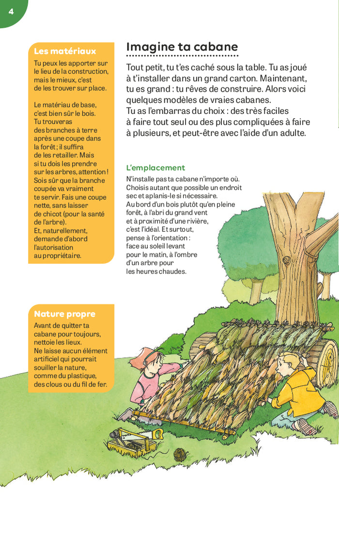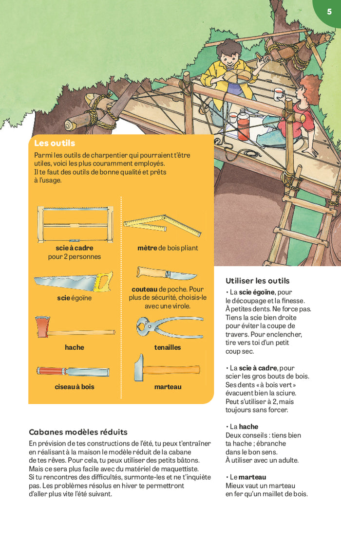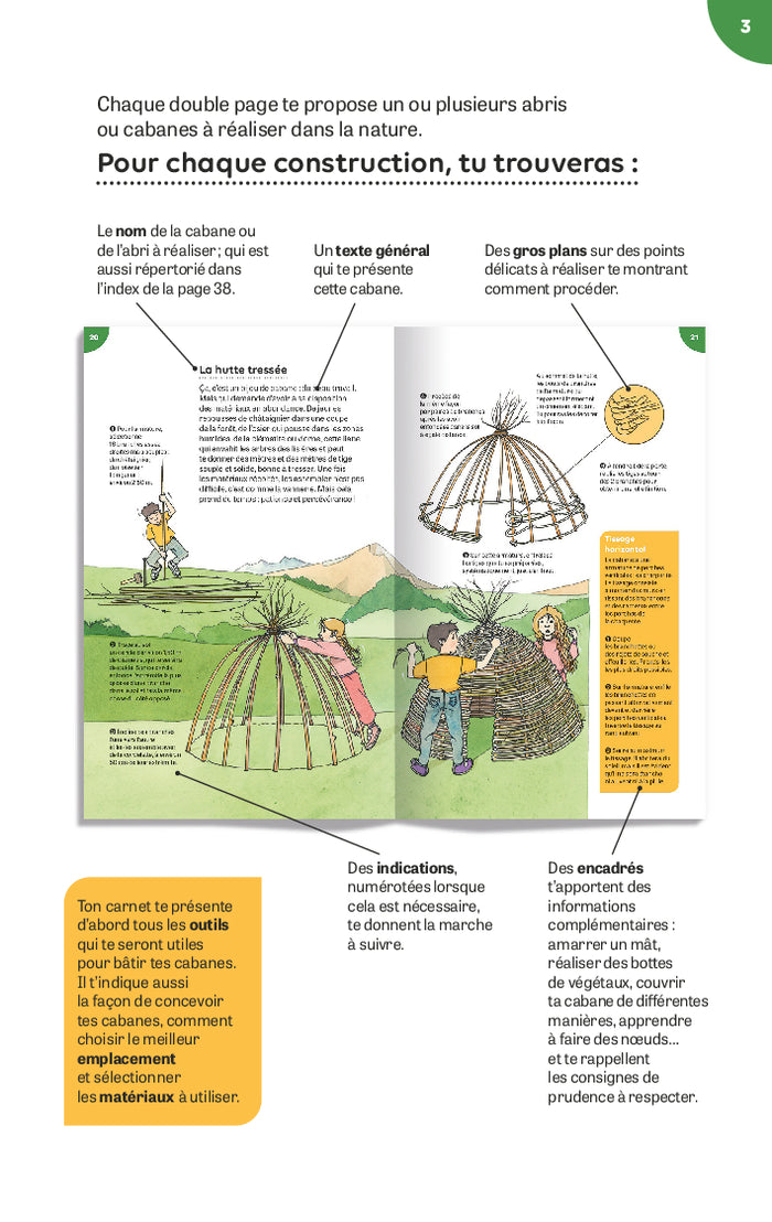 PrésentationBâtir une hutte dans la forêt ou une cabane dans un arbre, construire un abri sur l'eau ou un igloo dans la neige, quel enfant n'en a jamais rêvé ? Ce "Carnet de nature" lui propose des modèles de vraies cabanes, des très faciles à réaliser tout seul ou des plus compliquées à construire à plusieurs, et peut-être avec l'aide d'un adulte. Carnet de terrain / Carnet pratique Comment concevoir une cabane ? Comment choisir le bon emplacement ? Comment sélectionner les matériaux à utiliser ? Comment manier les outils ? Ce livre à glisser dans son sac ou dans sa poche répond à toutes ces questions. Chaque double page présente une ou plusieurs cabanes, avec une grande illustration principale, qui permet de visualiser la cabane, et des images secondaires, souvent techniques, pour expliciter les points délicats ou faire un focus sur un détail. Pour faciliter le suivi des différentes étapes, elles sont numérotées quand nécessaire. Des informations complémentaires viennent en encadré (amarrer un mât, réaliser des bottes de végétaux, couvrir ta cabane de différentes manières, apprendre à faire des noeuds...) et rappellent les consignes de prudence à observer. La structure de la maquette permet de s'y retrouver immédiatement et de comprendre en un regard comment on va s'y prendre. Les explications sont claires et concises : simples d'accès et faciles à mémoriser. Ce carnet est le guide idéal pour construire sans difficulté des cabanes en pleine nature. Peu de concurrence et un prix super concurrentiel Les cabanes font rêver tous les enfants, pourtant les guides qui permettent d'en construire sont peu nombreux. Celui-ci fait la différence, non seulement par la clarté de ses explications et de la maquette, mais aussi - et ce sera apprécié - par son format de poche et son faible prix (moitié moins cher que les concurrents !). Afficher moinsAfficher plus