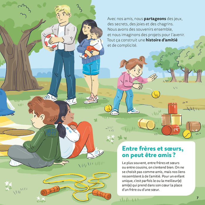 PrésentationUn "Mes p'tites questions" qui se penche sur un lien affectifindispensable à la construction des enfants En phase avec les enfants d'aujourd'hui, cet ouvrage fait la lumière sur les liens d'amitié qui permettent de s'épanouir et de grandir. Mais aussi sur ceux qui provoquent de grands chagrins d'enfance, pour accompagner les petits dans ces étapes importantes de la vie. Des questions pour permettre à l'enfant de mieux se comprendre, et de trouver sa place dans ses liens avec les autres. En expliquant les émotions liées à la thématique, et en évoquant des sujets de société, tels que le harcèlement scolaire ainsi que le consentement, nécessaire aux relations amicales. 16 questions d'enfants pour mieux se connaître et comprendre ses copains C'est quoi, l'amitié ? Ça sert à quoi, les amis ? Comment être un super-copain ? Pourquoi mon meilleur copain, c'est Hugo ? Pourquoi c'est parfois difficile de se faire des copains ? Est-ce que les filles et les garçons peuvent être copains ? Si je déménage, je vais perdre tous mes amis ? Ça arrive, les chagrins d'amitié ? On peut être ami avec quelqu'un pour de mauvaises raisons ? Pourquoi Naïma et son amie font tout pareil ? Pourquoi l'amitié peut rendre jaloux ? Pourquoi c'est plus facile de dire un secret à un ami ? Le harcèlement, c'est quoi ? C'est grave si je n'ai pas de copains ? Je suis obligé d'obéir à mon copain ? Est-ce que l'amitié dure toujours ? Pour tout comprendre facilement de l'amitié, un sentiment complexe Des réponses pédagogiques et documentaires, via des explications courtes et ludiques et des images vives et pleines de sensibilité qui immergent au coeur des relations amicales. Afficher moinsAfficher plus