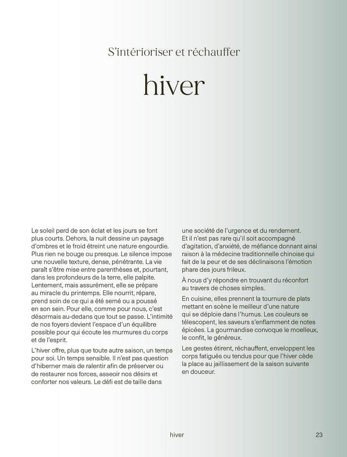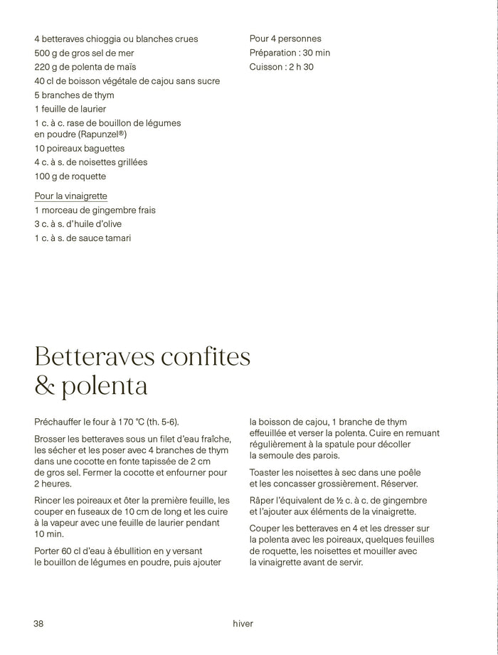 Ce livre de Caroline Wietzel propose 80 recettes et conseils pour une alimentation en harmonie avec les saisons. L'auteure, ancienne journaliste devenue psychopraticienne et enseignante de yoga, met en avant l'importance d'être à l'écoute de son corps et des variations saisonnières pour préserver sa vitalité. Elle aborde la relation entre alimentation, émotions et bien-être, et propose des programmes adaptés à chaque saison pour se sentir bien de l'intérieur. Un ouvrage complet qui allie cuisine, santé et développement personnel. Afficher moinsAfficher plus