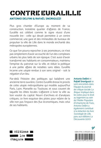 PrésentationTroisième quartier d'affaires de France, Euralille incarne l'arrivée de Lille dans le monde enchanté des métropoles européennes. Ce que l'on peut reprocher à ses promoteurs, ce n'est pas simplement d'avoir accouché d'un des complexes urbains les plus laids de son époque, mais d'avoir conçu une architecture oppressante, aboli les clivages politiques et transformé la ville en marchandise. Par-delà l'histoire des politiques qui balafrent une ancienne terre ouvrière, Contre Euralille dresse le procès de l'utopie métropolitaine qui sévit aujourd'hui à Paris, Lyon, Marseille ou Toulouse, pour que les villes ne soient plus modelées par les flux économiques, mais par les pratiques de leurs habitants. Afficher moinsAfficher plus