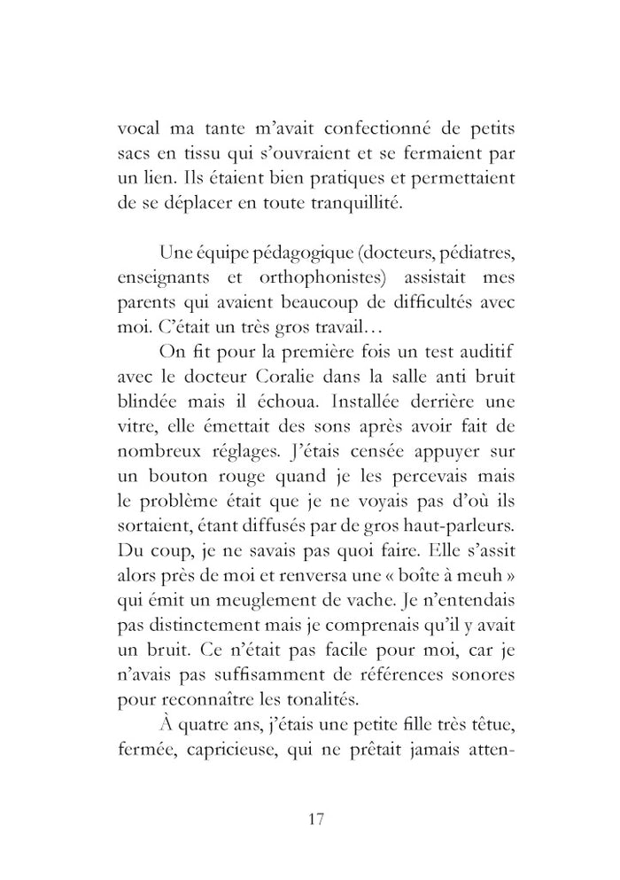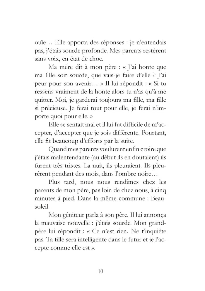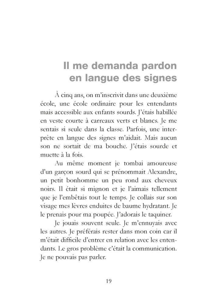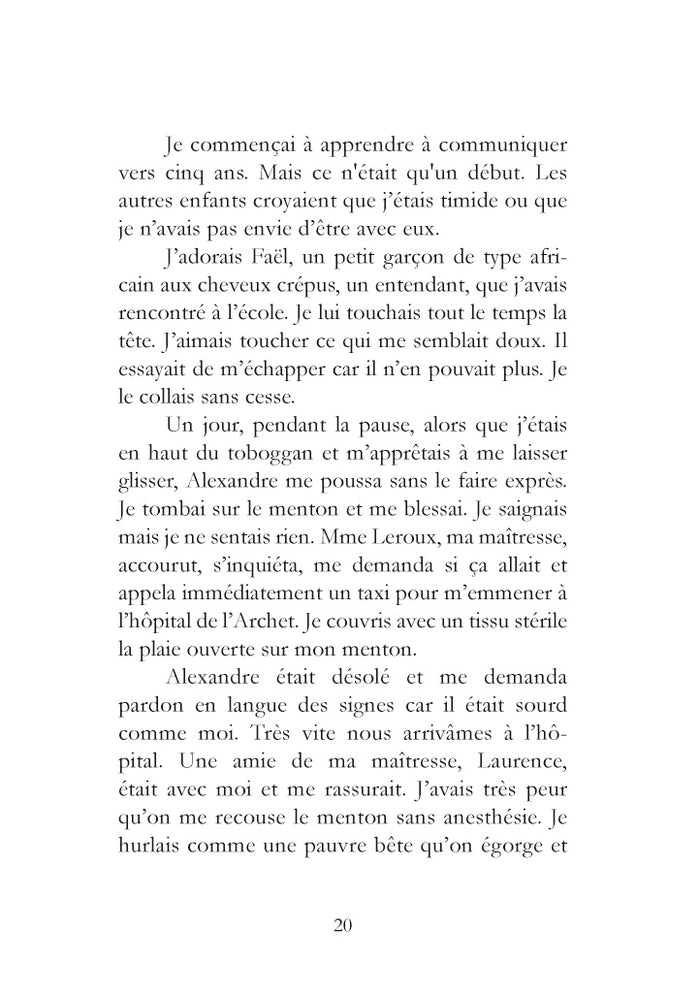 PrésentationChristelle nous livre, dans ce témoignage bouleversant, les difficultés scolaires que rencontrent les sourds, dont 80 % selon un rapport gouvernemental récent seraient illettrés. A quoi bon l'intégration quand elle engendre souffrance, frustration et accentue les discriminations vécues au quotidien ?En lisant ces lignes, le lecteur s'interroge sur les "bienfaits"de l'inclusion des sourds dans le système scolaire ordinaire. Favorisée par les pouvoirs publics, elle semblerait au contraire empêcher l'égalité des chances et aggraver l'échec scolaire.Ce texte rare (car très peu de sourds écrivent), nous propulse dans un univers étranger où les attitudes, l'esprit de groupe et les émotions nous nous surprennent. Le sous-texte, riche en pistes de réflexion psycho-socio-médicopédagogiques invite à considérer très sérieusement le problème. Afficher moinsAfficher plus