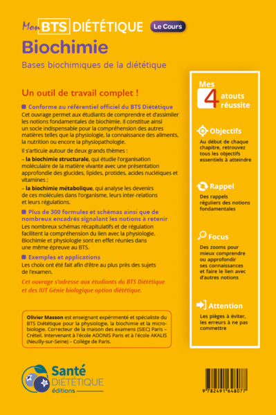 Ce manuel de biochimie permet aux étudiants de comprendre les notions fondamentales de ce domaine. Il s'articule autour de la biochimie structurale, qui étudie l'organisation moléculaire de la matière vivante, et de la biochimie métabolique, qui analyse les devenirs des molécules dans l'organisme. Le livre contient plus de 300 formules et schémas, ainsi que des encadrés signalant les notions importantes. Des schémas récapitulatifs et des exemples pratiques facilitent la compréhension. Cet ouvrage est particulièrement adapté aux étudiants en BTS de biochimie et physiologie. Afficher moinsAfficher plus