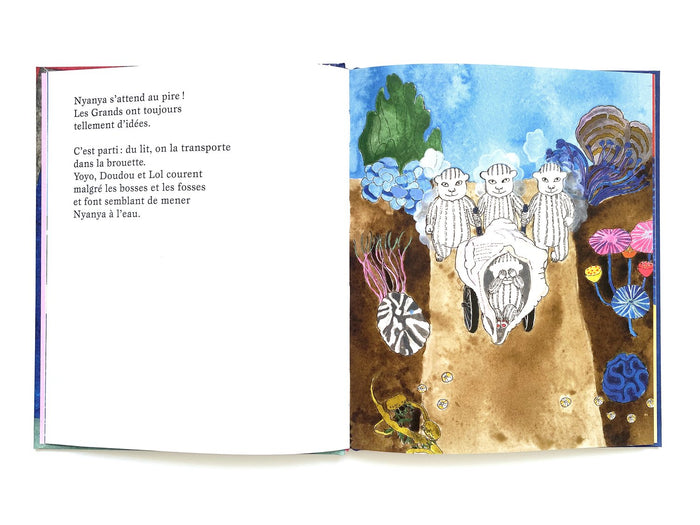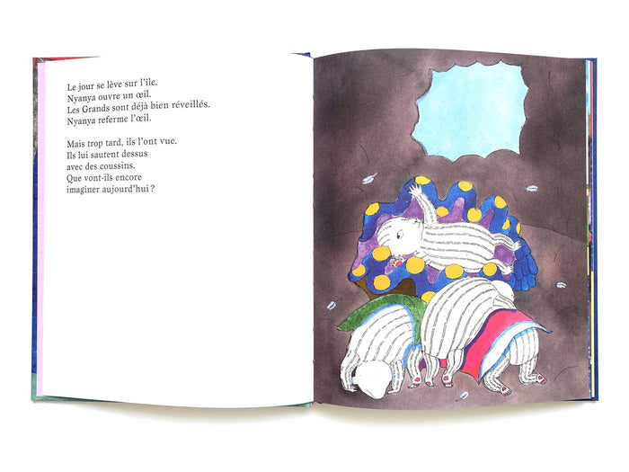 Nyanya vit sur une île où les trois grands s'amusent à embêter la plus petite. Un jour, un grand bébé arrive en soucoupe volante et c'est Nyanya qui le console. Ils deviennent complices, jouent ensemble, et le bébé repart au coucher du soleil. Nyanya garde cette expérience secrète, impressionnant les grands qui ne osent plus la tourmenter. Un conte empreint de mystère, d'entraide et de courage, magnifiquement illustré par Delphine Chedru. Afficher moinsAfficher plus