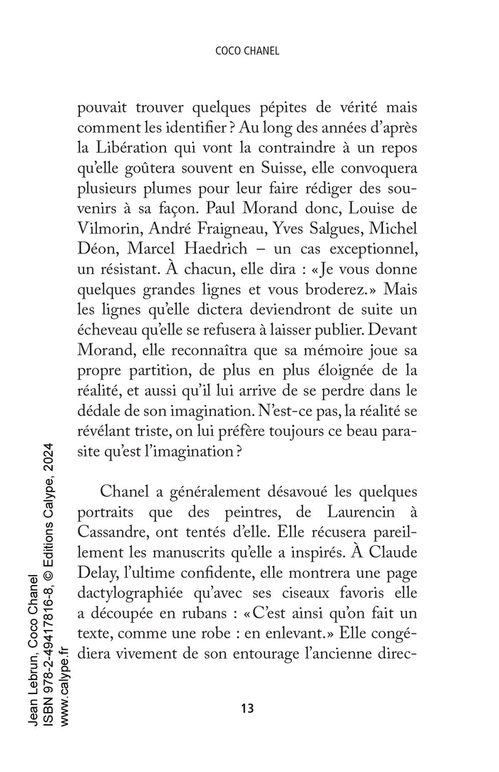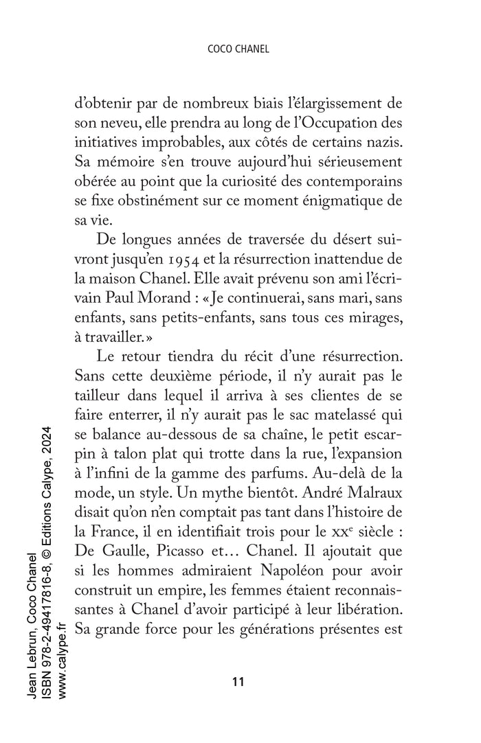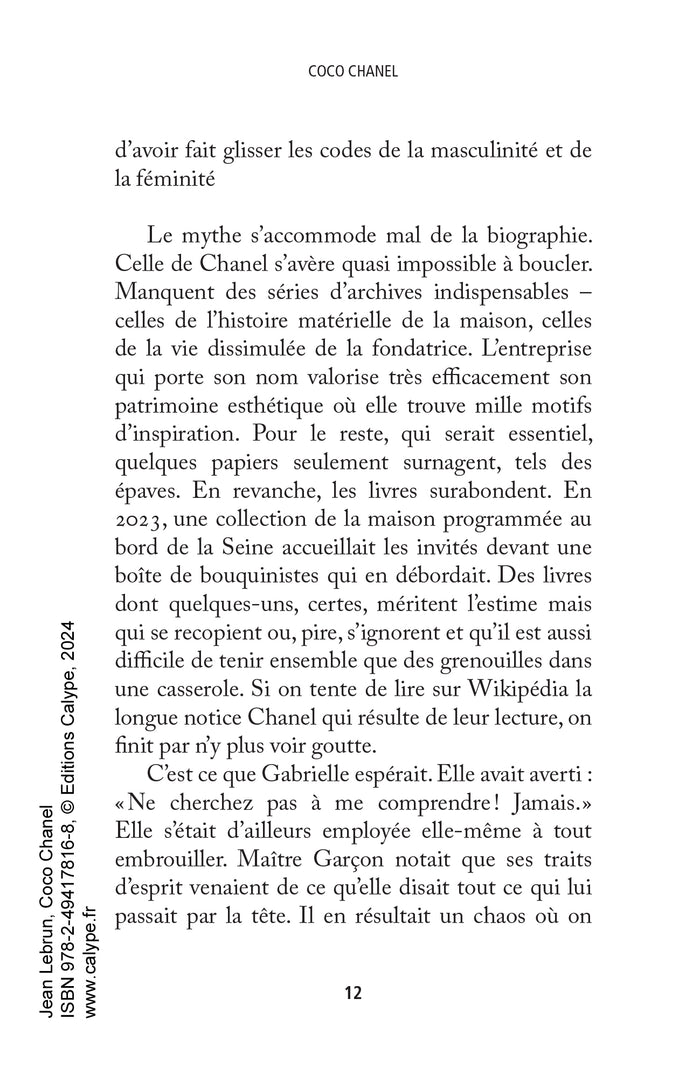 Jean Lebrun retrace le parcours fascinant de Coco Chanel, icône de la mode du XXe siècle. De son enfance modeste à son ascension fulgurante, en passant par ses amours tumultueuses et son rôle pendant la Seconde Guerre mondiale, l'auteur dresse le portrait d'une femme audacieuse et visionnaire. À travers cette biographie richement documentée, le lecteur découvre les coulisses de la maison de couture Chanel et l'héritage laissé par sa créatrice. Afficher moinsAfficher plus