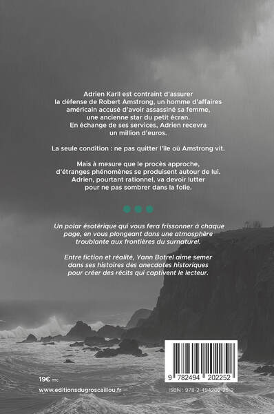 Dans ce thriller ésotérique, Adrien Karll se retrouve avocat de la défense d'un homme accusé d'avoir assassiné sa femme. Contraint de rester sur l'île de son client, il est confronté à des phénomènes surnaturels qui le plongent dans le doute. Entre fiction et réalité, il devra démêler les fils du mystère avant qu'il ne soit trop tard. L'auteur, Yann Botrel, mêle habilement suspense, paranormal et références historiques pour captiver le lecteur. Afficher moinsAfficher plus