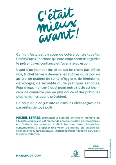 Dans cet essai, Michel Serres répond de manière humoristique et argumentée aux nostalgiques du passé qui affirment que "c'était mieux avant". Il remet en perspective cette vision en soulignant les progrès réalisés dans de nombreux domaines, tout en rappelant les horreurs du XXe siècle. Serres interroge notre rapport au temps, à la technologie et à la transmission des savoirs, mettant en lumière les enjeux de la société contemporaine. Afficher moinsAfficher plus
