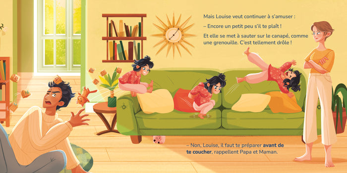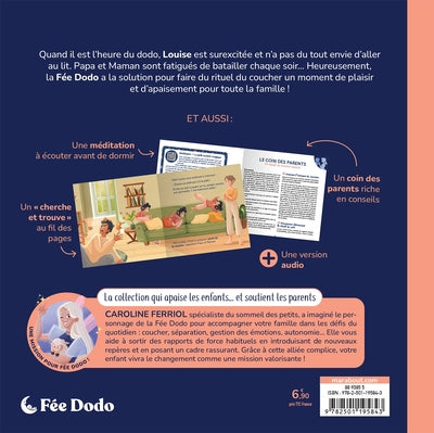 Louise est une petite fille pleine d'énergie qui déteste aller se coucher. Chaque soir, ses parents doivent batailler pour la mettre au lit. Heureusement, la Fée Dodo va leur venir en aide en proposant un rituel du coucher ludique et apaisant. Cette histoire fait partie d'une collection visant à accompagner les enfants dans leur endormissement, tout en fournissant aux parents des outils pratiques. En plus du récit, le livre propose une méditation à écouter, un jeu de Afficher moinsAfficher plus