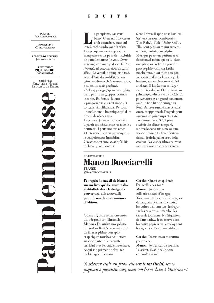 Ce livre d'art met en avant le travail de 30 illustratrices du monde entier, chacune illustrant un fruit choisi par l'auteur. Chaque fruit est présenté de manière artistique et ludique, offrant une vision originale et colorée. L'ouvrage permet de découvrir ou redécouvrir ces fruits sous un angle créatif, tout en apprenant des informations sur leur origine et leurs caractéristiques. Afficher moinsAfficher plus