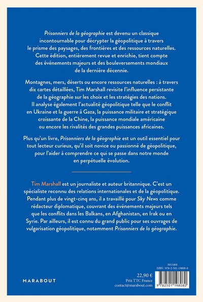 PrésentationPrisonniers de la géographieest devenu un classique incontournable pour décrypter la géopolitiqueà travers le prisme des paysages, des frontières et des ressources naturelles. Cetteédition, entièrement revue et enrichie, tient compte desévénements majeurs et des bouleversements mondiaux de la dernière décennie.  Montagnes, mers, déserts ou encore ressources naturelles :à travers dix cartes détaillées, Tim Marshall revisite l'influence persistante de la géographie sur les choix et les stratégies des nations. Il analyseégalement l'actualité géopolitique telle que le confliten Ukraine et la guerreà gaza, la puissance militaire et stratégique croissante de la Chine, la puissance mondiale américain ou encore les rivalités des grandes puissances africaines. Plus qu'un livre,Prisonniers de la géographieest un outil essentiel pour tout lecteur curieux, qu'il soit novice ou passionné de géopolitique, pour l'aiderà comprendre ce qui se passe dans notre monde en perpétuelleévolution. Afficher moinsAfficher plus