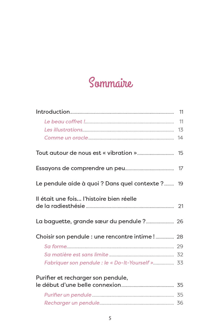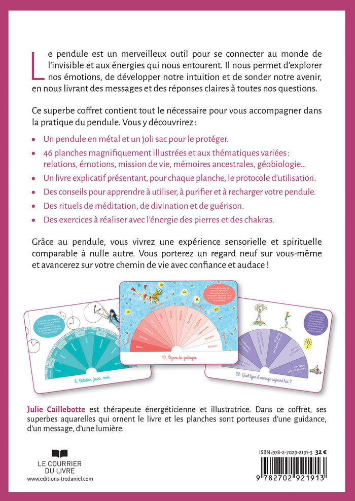 Note biographique Julie Caillebotteest thérapeute énergéticienne et illustratrice. Dans ce coffret, ses superbes aquarelles qui ornent le livre et les planches sont porteuses d'une guidance, d'un message, d'une lumière. ,Présentation Le pendule est un merveilleux outil pour se connecter au monde de l'invisible et aux énergies qui nous entourent. Il nous permet d'explorer nos émotions, de développer notre intuition et de sonder notre avenir, en nous livrant des messages et des réponses claires à toutes nos questions. Ce superbe coffret contient tout le nécessaire pour vous accompagner dans la pratique du pendule. Vous y découvrirez : - Un pendule en métal et un joli sac pour le protéger. - 46 planches magnifiquement illustrées et aux thématiques variées : relations, émotions, mission de vie, mémoires ancestrales, géobiologie... - Un livre explicatif présentant, pour chaque planche, le protocole d'utilisation. - Des conseils pour apprendre à utiliser, à purifier et à recharger votre pendule. - Des rituels de méditation, de divination et de guérison. - Des exercices à réaliser avec l'énergie des pierres et des chakras. Grâce au pendule, vous vivrez une expérience sensorielle et spirituelle Comparable à nulle autre. Vous porterez un regard neuf sur vous-même et avancerez sur votre chemin de vie avec confiance et audace! Afficher moinsAfficher plus