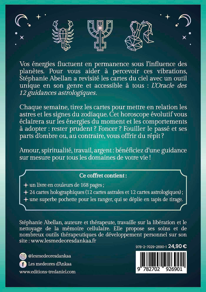 Ce coffret propose 12 guidances astrologiques personnalisées pour éclairer les domaines de l'amour, du chemin de vie, du travail et de l'argent. Vous y trouverez 24 cartes holographiques, un livre couleur de 168 pages et une pochette de rangement. L'auteure, Stéphanie Abellan, est à la fois écrivaine et thérapeute spécialisée dans la libération de la mémoire cellulaire. Elle met à votre disposition cet outil mêlant astrologie et développement personnel. Afficher moinsAfficher plus