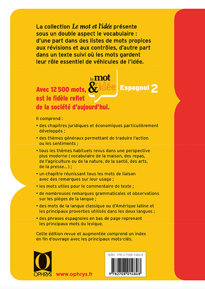 Un classique de l'apprentissage de l'espagnol, recommandé par les enseignants, refondu dans une nouvelle édition, revue et augmentée. Le vocabulaire espagnol aussi bien dans les domaines techniques que dans la langue courante. Les mots sont accompagnés de nombreuses remarques et d'exercices de traduction. La présentation thématique permet à l'élève de réviser les mots rencontrés au cours de ses lectures ou en classe. Il peut être utilisé soit de façon méthodique chapitre après chapitre, soit par thèmes en rapport avec les textes sur lesquels travaille l'élève. La nouvelle édition propose un enrichissement avec plus de 500 mots issus de nouvelles thématiques (changement climatique, terrorisme, migrations, etc.) ou de sujets ayant évolué (informatique) ainsi qu'un nouveau chapitre présentant les principales expressions utilisées dans les médias. L'organisation des chapitres a été revue et de nouveaux thèmes et sous titres ajoutés en leur sein. Afficher moinsAfficher plus