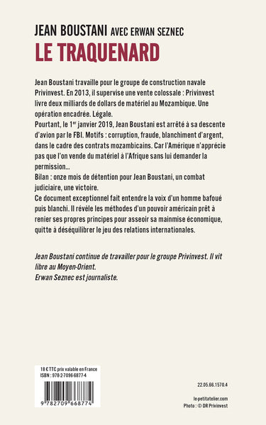 PrésentationJean Boustani travaille pour le groupe de construction navale Privinvest. En 2013, il supervise une vente colossale : Privinvest livre deux milliards de dollars de matériel au Mozambique. Une opération encadrée. Légale. Pourtant, le 1er janvier 2019, Jean Boustani est arrêtéà sa descente d’avion par le FBI. Motifs : corruption, fraude, blanchiment d’argent, dans le cadre des contrats mozambicains. Car l’Amérique n’apprécie pas que l’on vende du matérielà l’Afrique sans lui demander la permission… Bilan : onze mois de détention pour Jean Boustani, un combat judiciaire, une victoire. Ce document exceptionnel fait entendre la voix d’un homme bafoué puis blanchi. Il révèle les méthodes d’un pouvoir américain prêtà renier ses propres principes pour asseoir sa mainmiseéconomique, quitteà déséquilibrer le jeu des relations internationales. « Avec l’aide du journaliste Erwan Seznec, Jean Boustani décrit l’incroyable machination, longtemps restée secrète,dont il fut victime. Plus qu’un simple témoignage, le Traquenard est un réquisitoire implacable contre les dérives de l’impérialisme.»Valeurs actuelles Afficher moinsAfficher plus