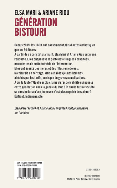 PrésentationDepuis 2019, les 18-34 ans consomment plus d’actes esthétiques  que les 50-60 ans. À partir de ce constat alarmant, Elsa Mari et Ariane Riou ont mené l’enquête. Elles ont poussé la porte des cliniques convoitées, conscientes de cette frénésie de l’intervention.  Elles ontécouté des mères et des filles remodelées,  la chirurgie en héritage. Mais aussi des jeunes hommes,  alléchés par les tarifs, au risque de graves complications. À qui la faute ? Quelle est la chaîne de responsabilité qui pousse  cette génération dans la gueule du loup ? Et quelle future société  se dessine lorsqu’une jeunesse n’est plus capable de s’aimer ? Édifiant. Indispensable. Afficher moinsAfficher plus