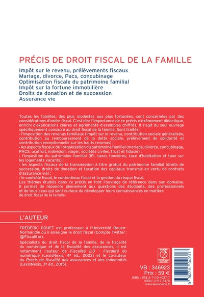 Ce précis de droit fiscal de la famille expose de manière détaillée et pédagogique les règles fiscales applicables aux situations familiales. Il aborde les différents aspects de la fiscalité liée au mariage, au concubinage, au PACS, aux enfants, aux donations et successions, ainsi qu'aux revenus et charges de famille. Cet ouvrage est un outil indispensable pour les étudiants en droit fiscal et les professionnels du droit. Afficher moinsAfficher plus