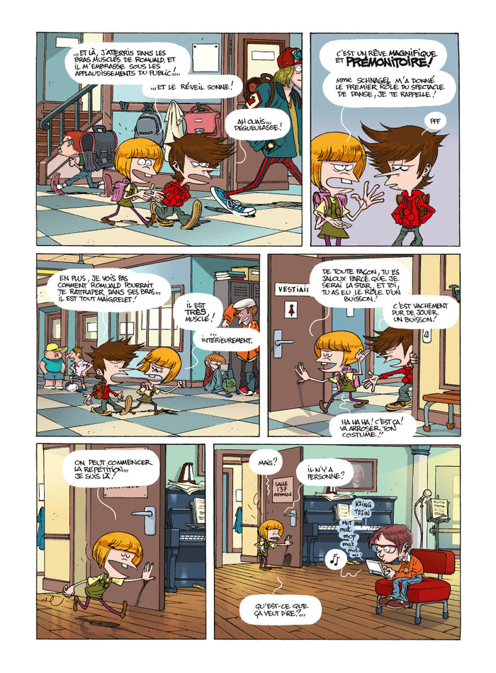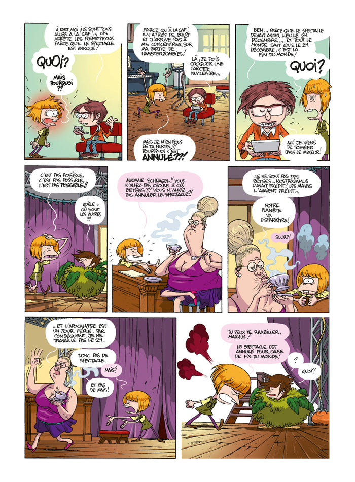 Présentation La fin du monde ? Y’a pas moyen, j’ai déjà un truc de prévu ! Le spectacle de fin d'année dans lequel Adèle avait le premier rôle est annulé. La raison ? Ilétait programmé le jour de la fin du monde ! Adèle est furax ! Qui est ce Nostradamus qui lui pourrit sa carrière de star ? Et ces Mayas ? On ne leur a rien demandé ! Marvin et sa sœur vont partir dans une grande aventure pour décaler la fin du monde d’au moins une semaine... Ils vont y affronter la Sainte Inquisition, Nostradamus en pleine séance de dédicaces, des Mayas assoiffés de sacrifices humains, des anacondas, des crocodiles et un T-Rex. Voici la première longue aventure desChronokids, dont le troisième tome avait reçu le Prix Jeunesse au Festival International de la BD d'Angoulême en 2011! LE DERNIER LIVREÀ LIRE AVANT LA FIN DU MONDE !!! Afficher moinsAfficher plus