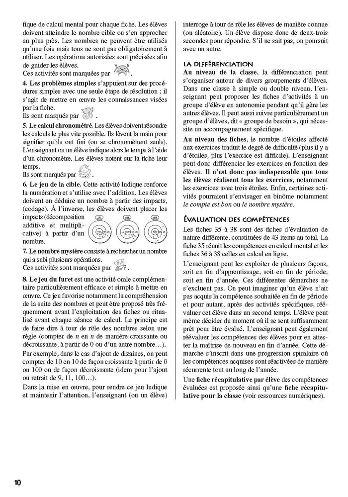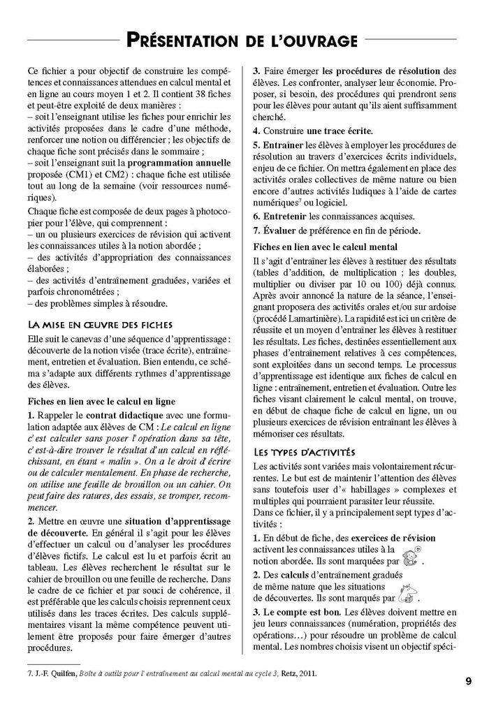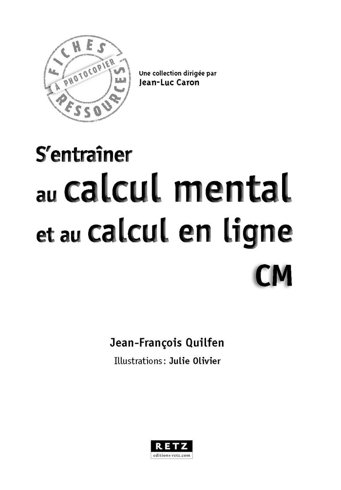 Présentation36 fiches photocopiables pour s'entrainer au calcul mental et au calcul en ligne en CM1 et CM2, à utiliser en complément des manuels usuels en mathématiques. 36 fiches photocopiablesqui ont pour objectif de conduire les élèves à : mémoriser les résultats (tables d'addition, de multiplication, doubles et moitiés...), mettre en place des procédures automatisées (multiplier par 10, 100...), développer des stratégies de calcul réfléchi pertinentes et efficaces, s'entrainer à la résolution de problèmes simples. Chaque fiche propose un ou plusieurs exercices de révision qui activent les connaissances utiles à la notion abordée, des activités d'entrainement de difficulté progressive, variées et parfois chronométrées, des exercices ludiques et des problèmes simples à résoudre mentalement. Les fiches d'évaluation permettent de suivre les acquis et la progression des élèves et à chaque fiche correspond une trace écrite de la notion visée, que les élèves peuvent conserver dans leur cahier de mémoire. Ressources numériques à télécharger: les PDF à vidéoprojeter et/ou à imprimer ainsi que la programmation des compétences, des fiches récapitulatives des compétences évaluées et les traces écrites. Afficher moinsAfficher plus