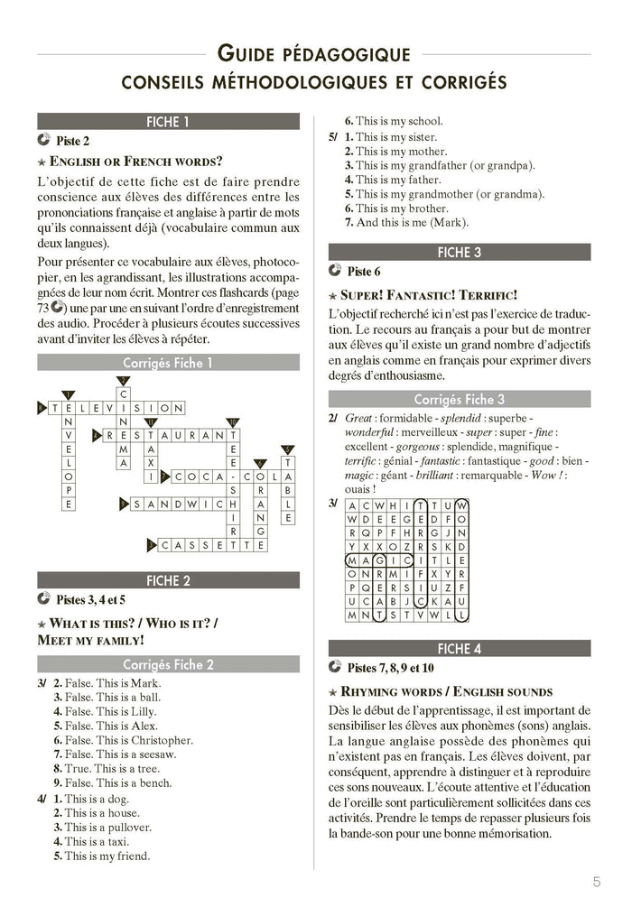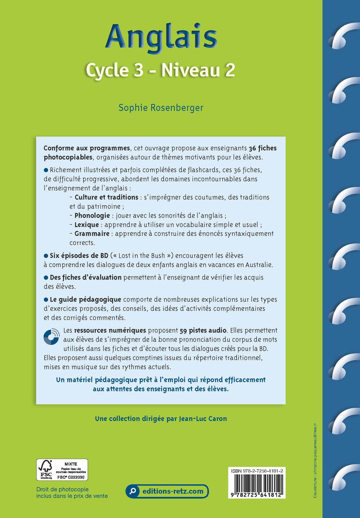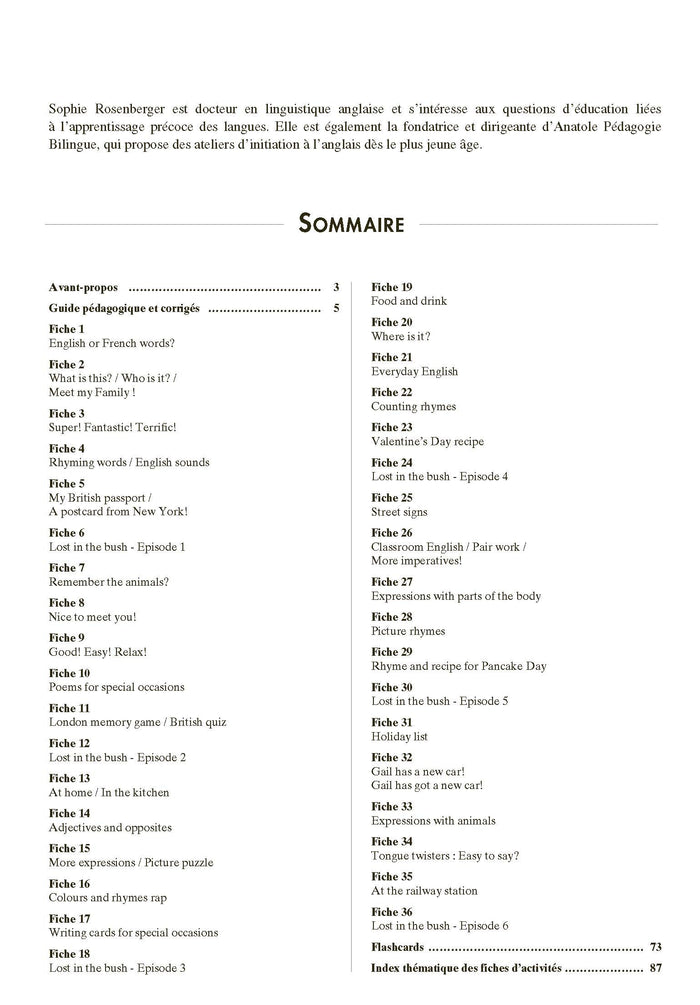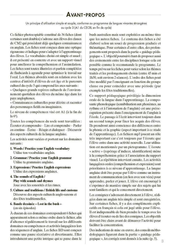 Cet ouvrage propose un ensemble de ressources pédagogiques pour enseigner l'anglais à des élèves de cycle 3 déjà initiés. Il comprend 36 fiches d'activités, une BD en 6 épisodes et 59 pistes audio. Les activités abordent la culture, la phonologie, le lexique et la grammaire anglaise. Le guide pédagogique fournit des explications, des conseils et des corrigés. Les ressources numériques offrent des pistes audio et des comptines. Adapté aux programmes scolaires. Afficher moinsAfficher plus