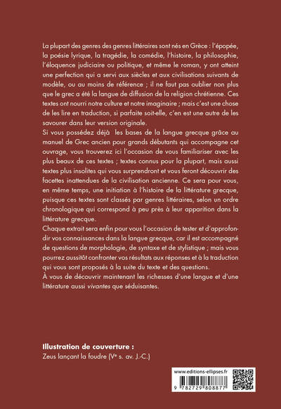 Présentation Cet ouvrage est destiné à tous ceux qui possèdent déjà les bases de la langue grecque et désirent se familiariser avec les beaux textes de la Grèce antique qui ont nourri notre culture et notre imaginaire. Chaque texte est accompagné de questions de morphologie, de syntaxe et de stylistique; ils permettent également un entraînement à la traduction. L'étudiant trouvera les réponses et la traduction dans le volume. Afficher moinsAfficher plus
