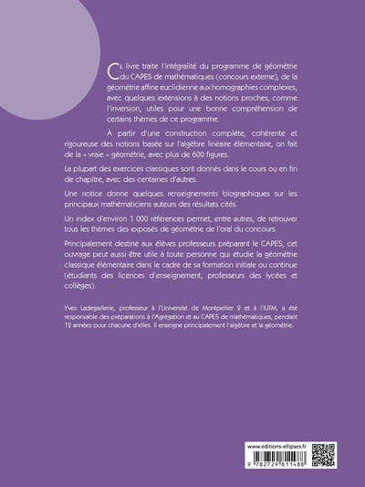 Cet ouvrage exhaustif aborde l'ensemble du programme de géométrie du CAPES de mathématiques, du plan affine euclidien aux homographies complexes, en passant par des extensions telles que l'inversion. Basé sur l'algèbre linéaire, il propose une approche rigoureuse et complète, illustrée par plus de 600 figures. De nombreux exercices, classiques ou inédits, accompagnent les chapitres. Une notice biographique des mathématiciens cités et un index bibliographique enrichissent le contenu. Afficher moinsAfficher plus