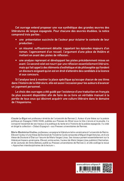 Ce recueil propose une synthèse des grandes œuvres des littératures de langue espagnole. Chaque notice comprend une présentation de l'auteur, un résumé détaillé de l'œuvre et une analyse littéraire approfondie. Les ouvrages sélectionnés sont accompagnés d'une traduction en français, en faisant un manuel accessible à tous ceux souhaitant acquérir une culture littéraire hispanique. Afficher moinsAfficher plus