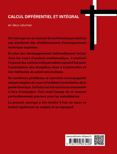 Présentation Cet ouvrage est un manuel de mathématiques destiné aux étudiants des établissements d’enseignement technique supérieur. En plus des développements habituellement traités dans les cours d’analyse mathématique, il contient l’exposé des notions indispensables aujourd’hui pour l’assimilation des disciplines liées à l’automation et aux méthodes de calcul automatique. De nombreux problèmes et exercices accompagnent chaque chapitre du cours et facilitent l’assimilation de la partie théorique. Certains ont été résolus et commentés à titre d’exemples. Cela rend l’usage de ce manuel particulièrement précieux pour les autodidactes. Le présent ouvrage a été réédité 9 fois en russe et traduit également en anglais et en espagnol. Afficher moinsAfficher plus
