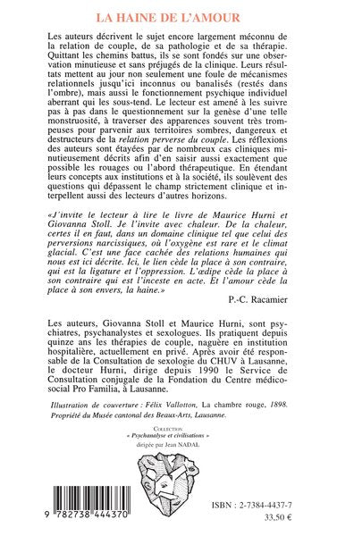 PrésentationLes auteurs décrivent le sujet encore largement méconnu la relation de couple, de sa pathologie et de sa thérapie. Quittant les chemins battus, ils se sont fondés sur une observation minutieuse et sans préjugés de la clinique. Leurs résultats mettent au jour non seulement une foule de mécanismes relationnels jusqu'ici inconnus ou banalisés (restés dans l'ombre), mais aussi le fonctionnement psychique individuel aberrant qui les sous-tend. Le lecteur est amené à les suivre pas à pas dans le questionnement sur la genèse d'une telle monstruosité, à traverser des apparences souvent très trompeuses pour parvenir aux territoires sombres, dangereux et destructeurs de la relation perverse du couple. Afficher moinsAfficher plus
