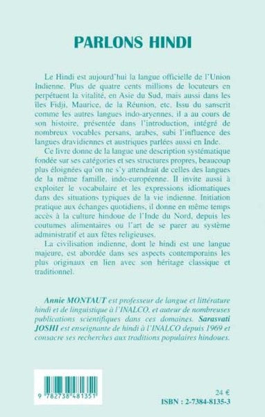 PrésentationLe Hindi est aujourd'hui la langue officielle de l'Union Indienne. Plus de quatre cents millions de locuteurs en perpétuent la vitalité, en Asie du Sud, mais aussi dans les îles Fidji, Maurice, de la Réunion, etc. Issu du sanscrit comme les autres langues indo-aryennes, il a au cours de son histoire, présentée dans l'introduction, intégré de nombreux vocables persans, arabes, subi l'influence des langues dravidiennes et austriques parlées aussi en Inde. Afficher moinsAfficher plus