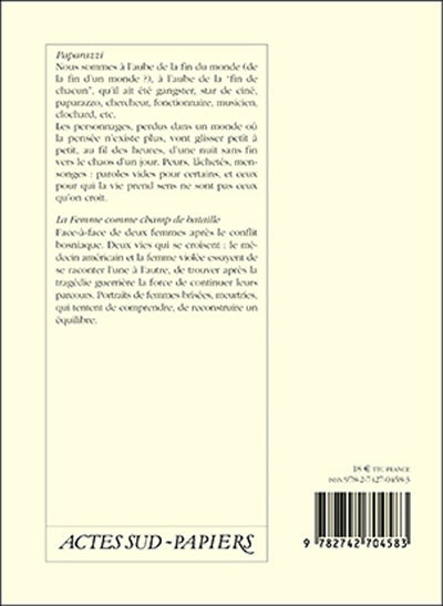 Présentation Paparazzi: Vingt-quatre personnages désorientés et désincarnés se croisent et révèlent leurs peurs, leurs lâchetés, leurs mensonges. Ils tentent de donner un sens à leur vie... 15 hommes, 5 femmes / 1 h 30 La femme comme champ de bataille: Face à face de deux femmes après le conflit bosniaque. Deux vies se croisent : le médecin américain et la femme violée essayent de se raconter l'une à l'autre. 2 femmes / 1 h 50 ,4e de couverture Paparazzi Nous sommes à l'aube de la fin du monde (de la fin d'un monde ?), à l'aube de la "fin de chacun", qu'il ait été gangster, star de ciné, paparazzo, chercheur, fonctionnaire, musicien, clochard, etc. Les personnages, perdus dans un monde où la pensée n'existe plus, vont glisser petit à petit, au fil des heures, d'une nuit sans fin vers le chaos d'un jour. Peurs, lâchetés, mensonges : paroles vides pour certains, et ceux pour qui la vie prend sens ne sont pas ceux qu'on croit. La Femme comme champ de bataille Face-à-face de deux femmes après le conflit bosniaque. Deux vies qui se croisent : le médecin américain et la femme violée essayent de se raconter l'une à l'autre, de trouver après la tragédie guerrière la force de continuer leurs parcours. Portraits de femmes brisées, meurtries, qui tentent de comprendre, de reconstruire un équilibre. Afficher moinsAfficher plus