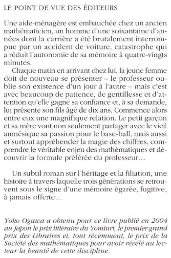 Une aide-ménagère est embauchée chez un ancien mathématicien, un homme d'une soixantaine d'années dont la carrière a été brutalement interrompue par un accident de voiture, catastrophe qui a réduit l'autonomie de sa mémoire à quatre-vingts minutes.Chaque matin en arrivant chez lui, la jeune femme doit de nouveau se présenter ― le professeur oublie son existence d'un jour à l'autre - mais c'est avec beaucoup de patience, de gentillesse et d'attention qu'elle gagne sa confiance et, à sa demande, lui présente son fils âgé de dix ans. Commence alors entre eux une magnifique relation. Le petit garçon et sa mère vont non seulement partager avec le vieil amnésique sa passion pour le base-bail, mais aussi et surtout appréhender la magie des chiffres, comprendre le véritable enjeu des mathématiques et découvrir la formule préférée du professeur...Un subtil roman sur l'héritage et la filiation, une histoire à travers laquelle trois générations se retrouvent sous le signe d'une mémoire égarée, fugitive, à jamais offerte...Biographie de l'auteurYôko Ogawa est l'une des figures majeures de la littérature japonaise. Toute son œuvre parue en français est publiée aux éditions Actes Sud.