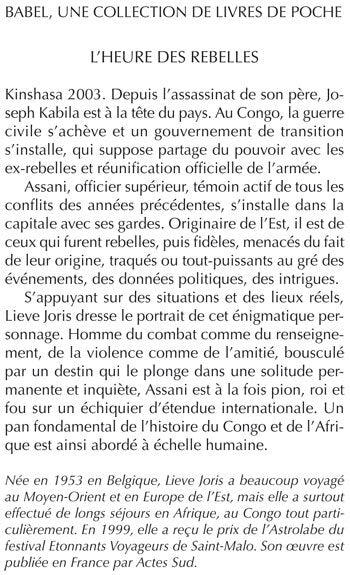 «Née en 1953 en Belgique, Lieve Joris a beaucoup voyagé au Moyen-Orient et en Europe de l'Est, mais elle a surtout effectué de longs séjours en Afrique, au Congo tout particulièrement. En 1999, elle a reçu le prix de l'Astrolabe du festival Etonnants Voyageurs de Saint-Malo. Son oeuvre est publiée en France par Actes Sud.»