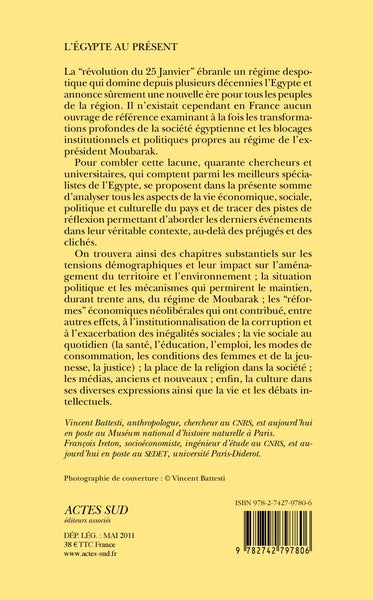 PrésentationLa "révolution du 25 Janvier" ébranle un régime despotique qui domine depuis plusieurs décennies l'Egypte et annonce sûrement une nouvelle ère pour tous les peuples de la région. Il n'existait cependant en France aucun ouvrage de référence examinant à la fois les transformations profondes de la société égyptienne et les blocages institutionnels et politiques propres au régime de l'exprésident Moubarak. Pour combler cette lacune, quarante chercheurs et universitaires, qui comptent parmi les meilleurs spécialistes de l'Egypte, se proposent dans la présente somme d'analyser tous les aspects de la vie économique, sociale, politique et culturelle du pays et de tracer des pistes de réfl exion permettant d'aborder les derniers événements dans leur véritable contexte, au-delà des préjugés et des clichés. On trouvera ainsi des chapitres substantiels sur les tensions démographiques et leur impact sur l'aménagement du territoire et l'environnement ; la situation politique et les mécanismes qui permirent le maintien, durant trente ans, du régime de Moubarak ; les "réformes" économiques néolibérales qui ont contribué, entre autres effets, à l'institutionnalisation de la corruption et à l'exacerbation des inégalités sociales ; la vie sociale au quotidien (la santé, l'éducation, l'emploi, les modes de consommation, les conditions des femmes et de la jeunesse, la justice) ; la place de la religion dans la société ; les médias, anciens et nouveaux ; enfin, la culture dans ses diverses expressions ainsi que la vie et les débats intellectuels.,4e de couvertureLa "révolution du 25 Janvier" ébranle un régime despotique qui domine depuis plusieurs décennies l'Egypte et annonce sûrement une nouvelle ère pour tous les peuples de la région. Il n'existait cependant en France aucun ouvrage de référence examinant à la fois les transformations profondes de la société égyptienne et les blocages institutionnelset politiques propres au régime de l'exprésident Moubarak. Pour combler cette lacune, quarante chercheurs et universitaires, qui comptent parmi les meilleurs spécialistes de l'Egypte, se proposent dans la présente somme d'analyser tous les aspects de la vie économique, sociale, politique et culturelle du pays et de tracer des pistes de réfl exion permettant d'aborder les derniers événements dans leur véritable contexte, au-delà des préjugés et des clichés. On trouvera ainsi des chapitres substantiels sur les tensions démographiques et leur impact sur l'aménagement du territoire et l'environnement ; la situation politique et les mécanismes qui permirent le maintien, durant trente ans, du régime de Moubarak ; les "réformes" économiques néolibérales qui ont contribué, entre autres effets, à l'institutionnalisation de la corruption et à l'exacerbation des inégalités sociales ; la vie sociale au quotidien (la santé, l'éducation, l'emploi, les modes de consommation, les conditions des femmes et de la jeunesse, la justice) ; la place de la religion dans la société ; les médias, anciens et nouveaux ; enfin, la culture dans ses diverses expressions ainsi que la vie et les débats intellectuels. Afficher moinsAfficher plus