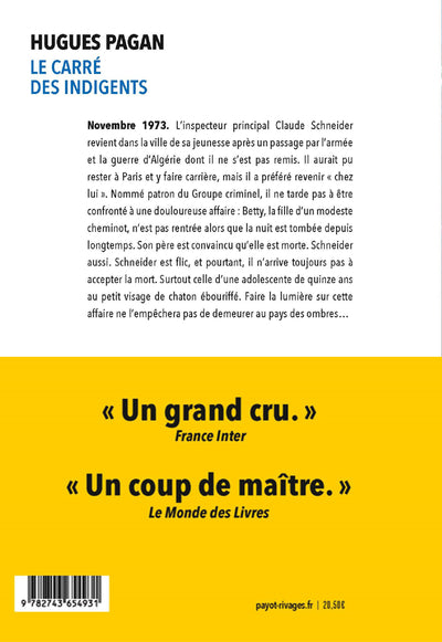 Dans «Le Carré des indigents, nous retrouvons l'inspecteur principal Claude Schneider, protagoniste récurrent des romans d'Hugues Pagan. Nous sommes dans les années 1970, peu avant la mort de Pompidou et l'accession de Giscard au pouvoir. Schneider est un jeune officier de police judiciaire, il a travaillé à Paris et vient d'être muté dans une ville moyenne de l'est de la France, une ville qu'il connaît bien. Dès sa prise de fonctions, un père éploré vient signaler la disparition de sa fille Betty, une adolescente sérieuse et sans histoires. Elle revenait de la bibliothèque sur son Solex, elle n'est jamais rentrée. Schneider a déjà l'intuition qu'elle est morte. De fait le cadavre de la jeune fille est retrouvé peu après, atrocement mutilé au niveau de la gorge.