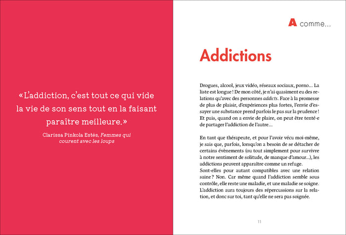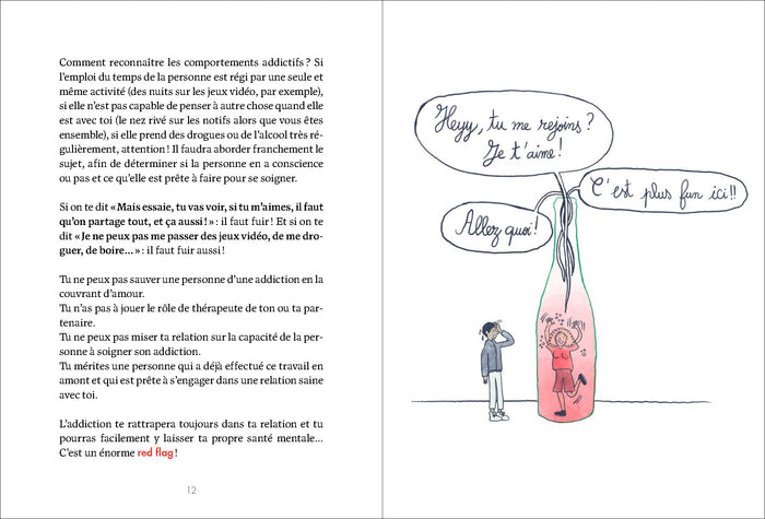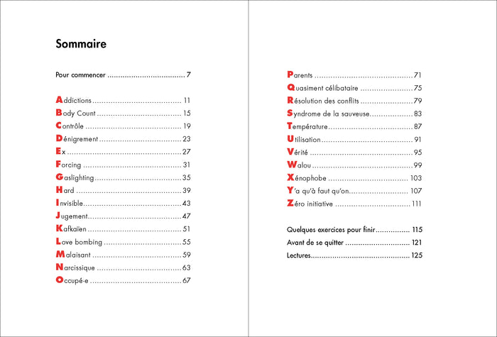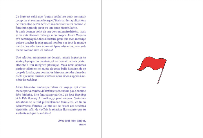 PrésentationRepérez les red flags avant qu'il ne soit trop tard ! Vous avez uncrush? Vous vous apprêtez àdater? Mais n'y aurait-il pas des signes qui devraient vous alerter ? des chauds et froids soudains, un emploi du temps surchargé, des jugements lapidaires ? Ce sont autant de red flags ! Ce guide, Anne Latuille en aurait rêvé quand elle enchaînait lesdatesfoireux. Grâce à ses conseils, apprenez à identifier les comportements toxiques, à vous protéger et à éviter les déceptions ou les blessures émotionnelles. Un outil indispensable pour reprendre le contrôle de vos relations amoureuses et votre arme secrète pour vous aider à faire les bons choix. Un ouvrage précieux à lire, à offrir, et à garder à portée de main ! Ce guide novateur aborde avec fraîcheur et pertinence un sujet qui interpelle : les signaux d'alerte dans les relations amoureuses. Sous forme d'un abécédaire original et accessible, il décrypte les comportements problématiques à repérer dès les premiers rendez-vous. Chaque chapitre, concis et percutant,traite d'un signal d'alerte spécifique, de l'Addiction au Zéro initiative, en passant par le Love Bombing et le Forcing. Un livre plein de conseils pratiques et bienveillants pour développer son discernement et sa confiance en soi, auxquels les illustrations couleur de Maya Orhan apportent une touche d'humour et de légèreté ! Afficher moinsAfficher plus