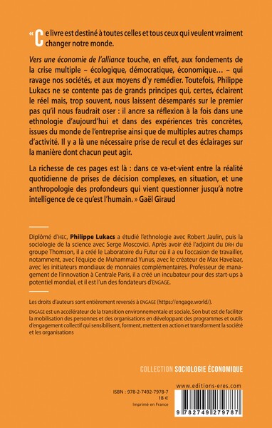 Vers une économie de l’alliancetouche, en effet, aux fondements de la crise multiple – écologique, démocratique, économique… – qui ravage nos sociétés, et aux moyens d’y remédier. Toutefois, Philippe Lukacs ne se contente pas de grands principes qui, certes, éclairent le réel mais, trop souvent, nous laissent désemparés sur le premier pas qu’il nous faudrait oser : il ancre sa réflexion à la fois dans une ethnologie d’aujourd’hui et dans des expériences très concrètes, issues du monde de l’entreprise ainsi que de multiples autres champs d’activité. Il y a là une nécessaire prise de recul et des éclairages sur la manière dont chacun peut agir.