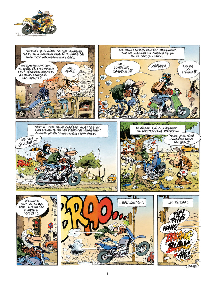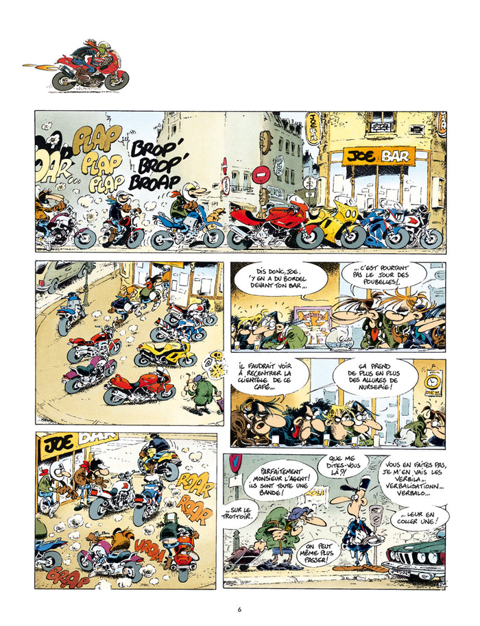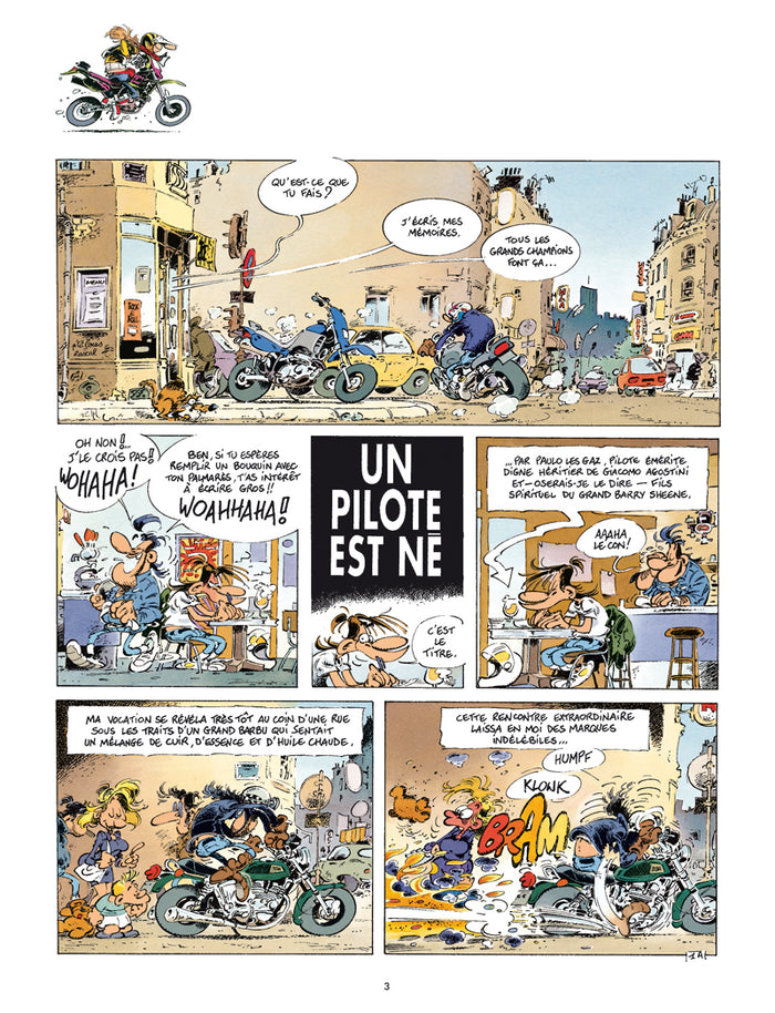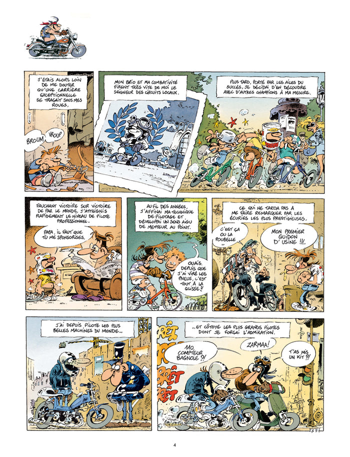 PrésentationIls sont 7 cinglés à moto prêts à tout. Champions des tours chronométrés du pâté de maison, ces rois de l'arsouille cumulent les gamelles. Quand ils ne sont pas sur leurs motos, on les retrouve au comptoir du Joe Bar en train de commenter leurs derniers exploits avec une mauvaise foi de rigueur ... Cette BD qui pétarade, sent l'huile bouillie et le radar cramé, est plus qu'un succès phénoménal. Tous les motards en herbe se sont réveillés à la lecture de ces gags pour, à l'unisson, chanter la gloire duJoe Bar Team... refrain repris en coeur par les lecteurs de BD du monde entier. Opération lifting pour leJoe Bar Team, la série culte des années 90, qui change la carrosserie de ses 4 bolides : une nouvelle impression et 4 nouvelles couvertures, dynamiques et accrocheuses, viennent revitaminer la collection qui s'apprête, du même coup, à toucher encore plus de nouveaux lecteurs. En attendant l'arrivée du tome 5, signéBar2, et le raz de marée qui s'en suivra, voici les aventures duJoe Bar Teamprêtes à gagner tout un tas de nouvelles courses ! Un superbe coffret est également disponible. Afficher moinsAfficher plus