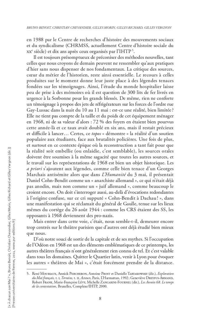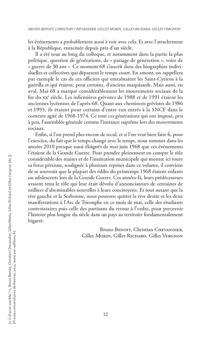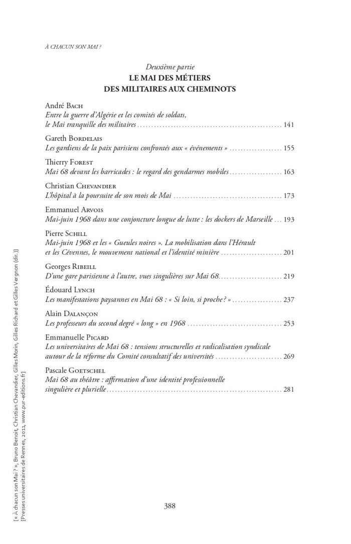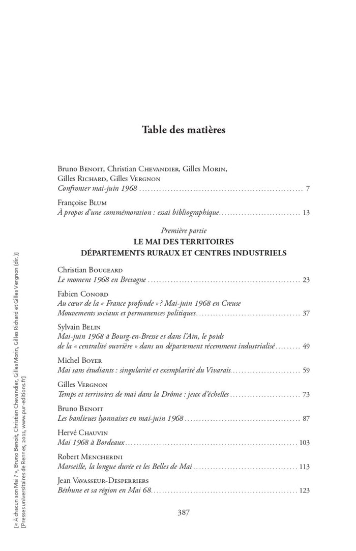 Cet ouvrage collectif, issu d'un colloque tenu à Lyon en mars 2009, se penche sur les événements de Mai 68 en France. Il explore comment ces événements ont été vécus et ressentis de manière diversifiée, en dehors de la mémoire parisienne dominante. Les contributions analysent le déroulement de Mai 68 dans les départements ruraux, semi-ruraux, les centres industriels provinciaux, ainsi que parmi les forces de l'ordre, les cheminots, les enseignants, les hospitaliers et les différents acteurs politiques de l'époque. Ce livre s'attache à des aspects moins étudiés de Mai 68, offrant des réponses précises et nouvelles à ces questions. Avec le soutien de l'université Rennes 1. Afficher moinsAfficher plus