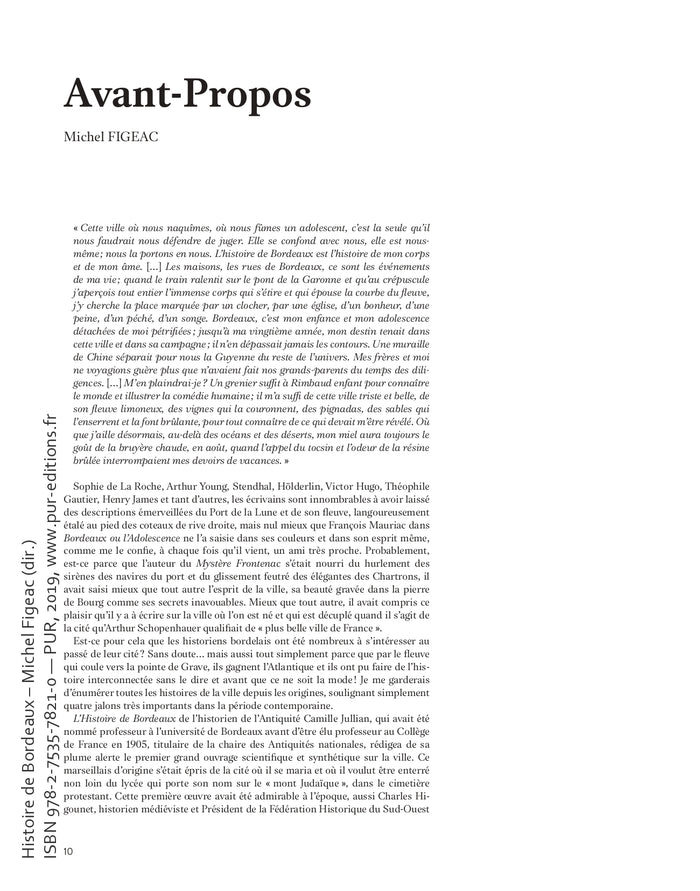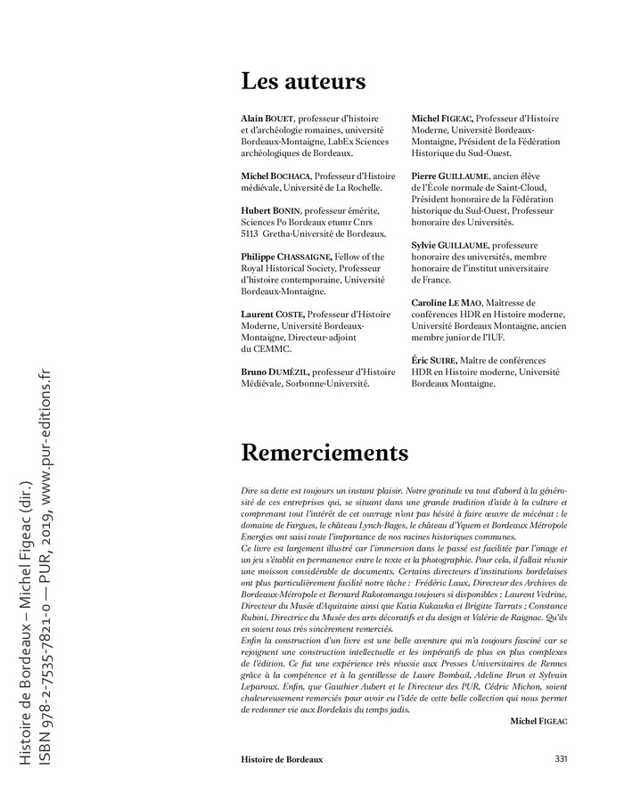 Présentation Encore une Histoire de Bordeaux ? En réalité, celle-ci n'a rien de commun avec ses devancières. Cet ouvrage obéit au désir très précis d'une écriture synthétique, allant à l'essentiel, et abondamment illustrée. En d'autres termes, réaliser un beau livre s'appuyant sur des fondements scientifiques incontestables. Un livre qui fera honneur à notre ville, à l'école historique bordelaise actuelle et qui contribuera à mieux faire connaître une cité qui est sortie de sa gangue de pierre pour courir vers le million d'habitants. Une ville qui attire aussi bien ces Parisiens qui se précipitent le matin vers la capitale dans les tunnels de la gare Saint-Jean que les touristes que déversent les bateaux de croisière sur des quais où les hangars et les grues n'existent plus que dans la mémoire des plus anciens et sur les photos de notre livre. Une nouvelleHistoire de Bordeauxétait aussi une nécessité parce qu'en quarante ans, au rythme des fouilles archéologiques qui se sont multipliées avec les différents chantiers urbains, mais aussi avec les innombrables thèses, notre vision de la ville a été modifiée de fond en comble. De nouvelles modes historiographiques sont apparues sansparler de fortes attentes sociales comme celle autour de la traite négrière ou de la Seconde Guerre mondiale et de l'occupation. Depuis, les archives se sont ouvertes, les découvertes se sont multipliées, des livres ont été écrits et des colloques se sont tenus, par exemple sur l'affaire Papon. L'un des grands objectifs de ce livre est de répondre à cette attente, de faire un bilan et plus globalement de suivre les centres d'intérêt actuels de l'historiographie. ,4e de couverture Encore une Histoire de Bordeaux ? En réalité, celle-ci n'a rien de commun avec ses devancières. Cet ouvrage obéit au désir très précis d'une écriture synthétique, allant à l'essentiel, et abondamment illustrée. En d'autres termes, réaliser un beau livre s'appuyant sur des fondements scientifiques incontestables. Un livre qui fera honneur à notre ville, à l'école historique bordelaise actuelle et qui contribuera à mieux faire connaître une cité qui est sortie de sa gangue de pierre pour courir vers le million d'habitants. Une ville qui attire aussi bien ces Parisiens qui se précipitent le matin vers la capitale dans les tunnels de la gare Saint-Jean que les touristes que déversent les bateaux de croisière sur des quais où les hangars et les grues n'existent plus que dans la mémoire des plus anciens et sur les photos de notre livre. Une nouvelleHistoire de Bordeauxétait aussi une nécessité parce qu'en quarante ans, au rythme des fouilles archéologiques qui se sont multipliées avec les différents chantiers urbains, mais aussi avec les innombrables thèses, notre vision de la ville a été modifiée de fond en comble. De nouvelles modes historiographiques sont apparues sans parler de fortes attentes sociales comme celle autour de la traite négrière ou de la Seconde Guerre mondiale et de l'occupation. Depuis, les archives se sont ouvertes, les découvertes se sont multipliées, des livres ont été écrits et des colloques se sont tenus, par exemple sur l'affaire Papon. L'un des grands objectifs de ce livreest de répondre à cette attente, de faire un bilan et plus globalement de suivre les centres d'intérêt actuels de l'historiographie. Afficher moinsAfficher plus