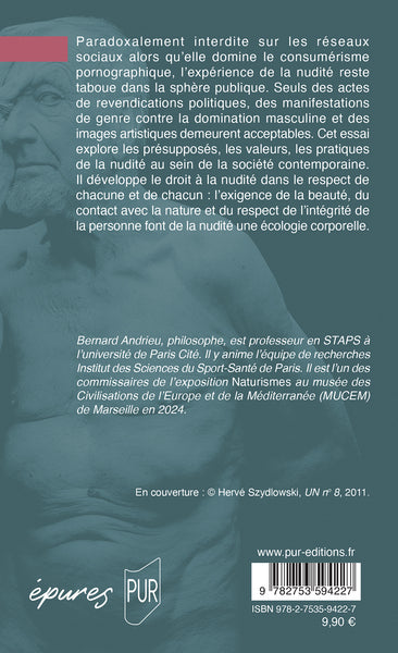 L'essai "Nudités" de Bernard Andrieu aborde la question de la nudité dans notre société. L'auteur explore les tabous entourant la nudité, les actes de revendication politique, les manifestations de genre et les représentations artistiques qui la mettent en scène. Il défend le droit à la nudité comme une forme d'écologie corporelle, prônant le respect de soi et des autres. Andrieu interroge les normes de beauté, le rapport à la nature et l'intégrité personnelle, invitant le lecteur à repenser sa vision de la nudité. Afficher moinsAfficher plus