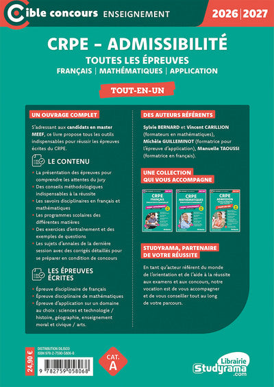 Ce livre s'adresse aux candidats en master MEEF et propose tous les outils indispensables pour réussir les épreuves écrites du CRPE. Il comprend la présentation des épreuves, des conseils méthodologiques, les savoirs disciplinaires en français et mathématiques, les programmes scolaires, des exercices d'entraînement, des exemples de questions, ainsi que les sujets d'annales de la dernière session avec des corrigés détaillés. Afficher moinsAfficher plus