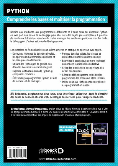PrésentationVous découvrez Python et vous voulez progresser dans la maitrise de ce langage ? Cet ouvrage de base est fait pour vous. Vous comprendrez tous les concepts inconrtournables et vous apprendrez à les mettre en pratique en vous exerçant avec les nombreux exercices proposés. Accessible et plaisant à lire, ce livre sur Python est destiné aux étudiants qui découvrent Python, aux programmeurs débutants et à ceux qui commencent à bien maitriser ce langage.  Il explique tous les concepts importants en Python 3. Il mixe tutoriels et recettes de code style "livre de cuisine", parfois avec humour, ce qui rend le livre d'un accès aisé et pratique. Les nombreux exercices situés en fin de chapitre aident le lecteur à mettre en pratique les connaissances acquises. Il propose les meilleures pratiques pour les tests, le débogage, la réutilisation du code et d'autres conseils de développement, grâce à de nombreux outils Python et packages open source.,En brefVous découvrez Python et vous voulez progresser dans la maitrise de ce langage ? Cet ouvrage de base est fait pour vous. Vous comprendrez tous les concepts inconrtournables et vous apprendrez à les mettre en pratique en vous exerçant avec les nombreux exercices proposés. Afficher moinsAfficher plus