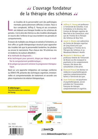 Publié en 2003, cet ouvrage fondateur de la thérapie des schémas est le fruit des travaux de Jeffrey E. Young et de ses co-auteurs. Ils proposent une approche novatrice pour traiter les troubles de la personnalité en se focalisant sur les schémas de pensée ingrains. Le livre présente 18 schémas types, les techniques de diagnostic et de traitement, ainsi que des outils pour modifier les comportements problématiques. Une approche intégrative, prenant en compte les aspects cognitifs, émotionnels et comportementaux, est privilégiée, avec une importance accordée à la relation thérapeutique. Afficher moinsAfficher plus