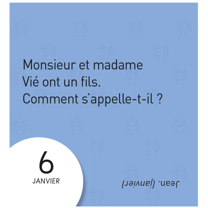 Ce mini calendrier propose une blague par jour mettant en scène le couple "Monsieur et Madame". Les blagues sont courtes et humoristiques, idéales pour se divertir quotidiennement. Afficher moinsAfficher plus