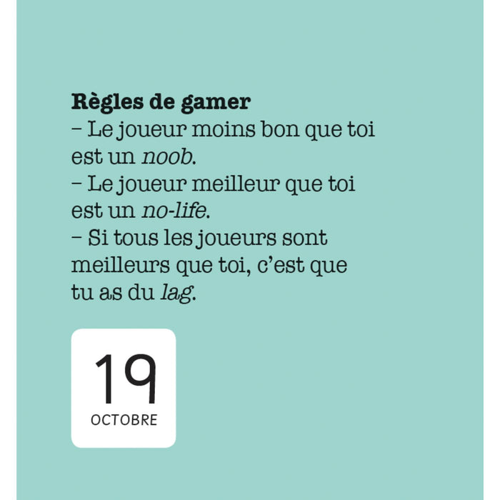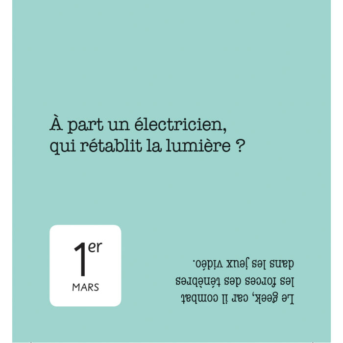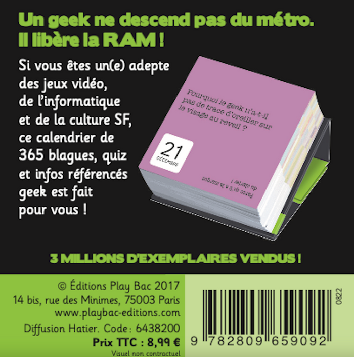 Ce mini calendrier propose une blague, un quiz ou une information geek pour chaque jour de l'année. Idéal pour les passionnés de jeux vidéo, d'informatique et de culture SF, il permet de se divertir quotidiennement avec des références geek. Afficher moinsAfficher plus