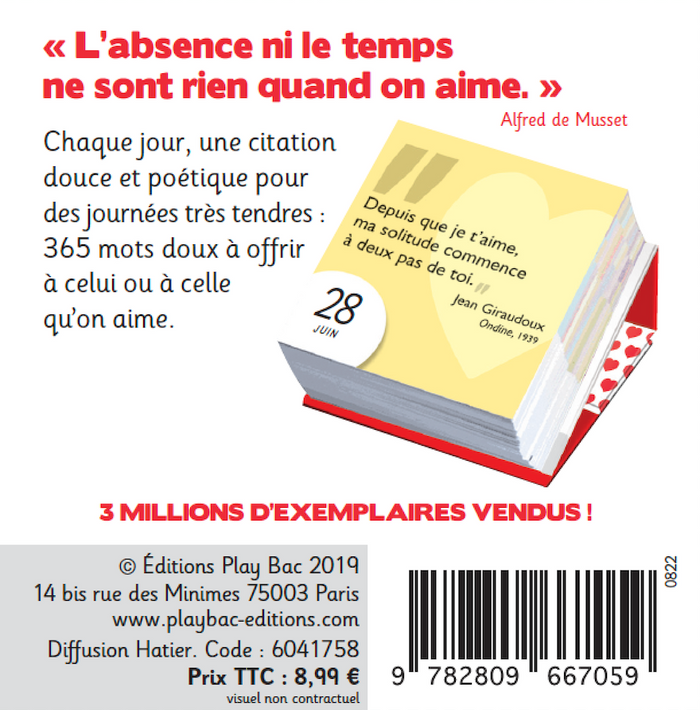 Présentation Chaque jour, une citation douce et poétique pour des journées très tendres. Un mini calendrier qui vous fera voir la vie en rose tout au long de l'année ouà offrir pour semer de l'amour autour de vous. La collection qui a déjà séduit 4 MILLIONS de fans ! Afficher moinsAfficher plus