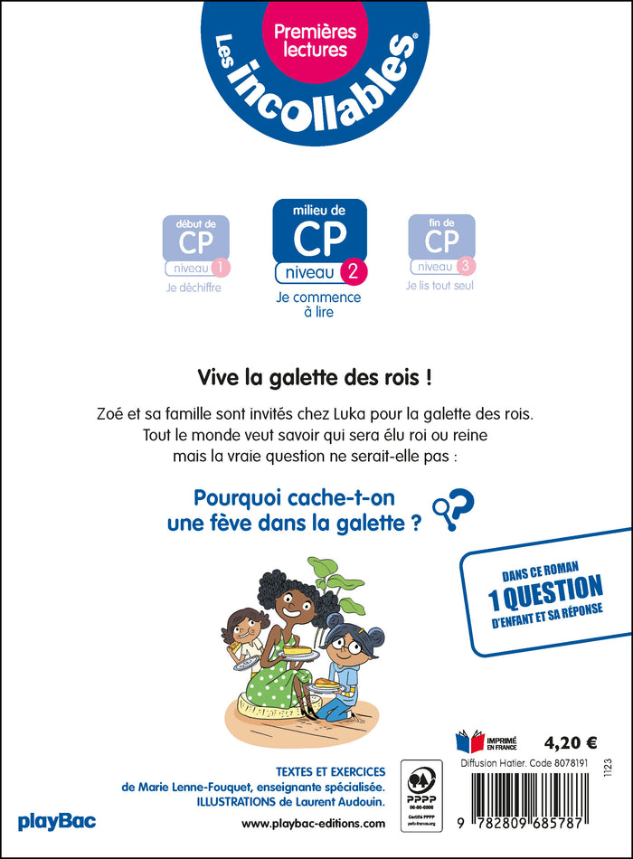 PrésentationLes premières lectures Incollables pour apprendreà lire età se questionner ! Des histoires spécialement conçues par une enseignante, avec un vocabulaire adapté à chaque niveau et conforme au programme scolaire. Et comme votre enfant est curieux, chaque lecture est accompagnée d’une question sur le monde qui l’entoure et sa réponse, pour stimuler son esprit. Avec en bonus : des conseils pour accompagner son enfant dans la lecture, des sons, des quiz et des activités. Dans cette histoire : Zoé et sa famille sont invités chez Luka pour la galette des rois. Tout le monde veut savoir qui seraélu roi ou reine mais la vraie question ne serait-elle pas  : Pourquoi cache-t-on une fève dans la galette  ?  Milieu de CP : Niveau 2 - Je commenceà lire Dès 5 ans. Afficher moinsAfficher plus