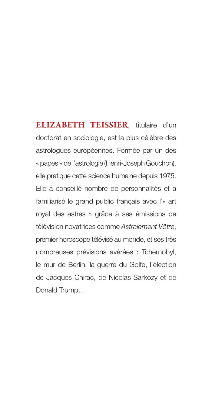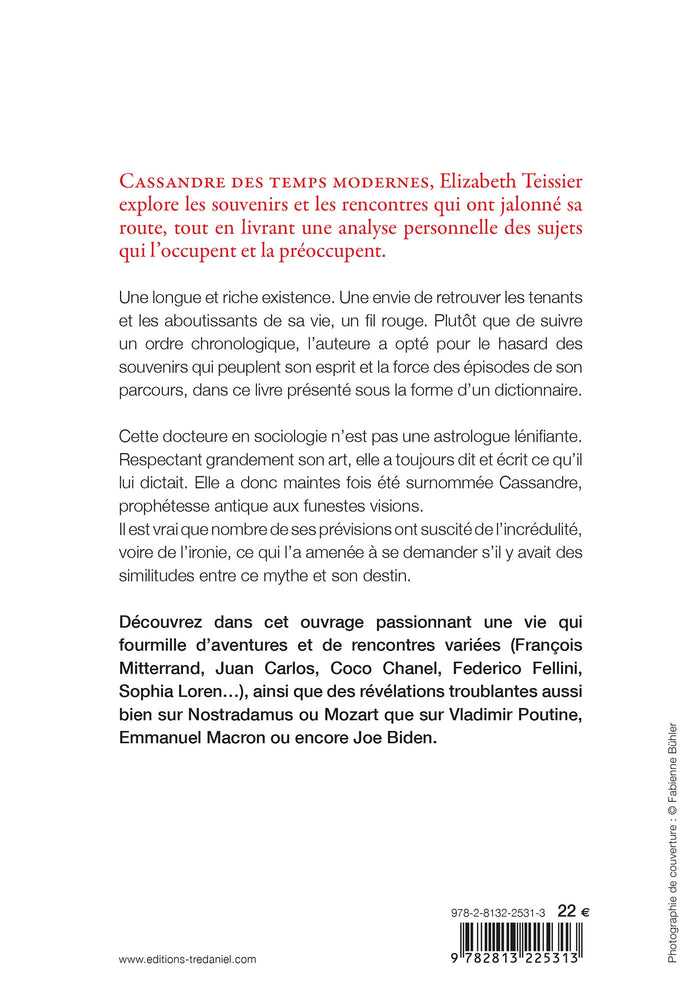 Dans cet ouvrage, Elizabeth Teissier, astrologue de renom, dévoile les mémoires d'une vie riche en révélations. Elle se présente comme une Cassandre des temps modernes, mêlant souvenirs, rencontres et analyses. Son parcours atypique l'a menée à côtoyer de nombreuses personnalités et à formuler des prédictions qui ont marqué l'histoire. À travers ce dictionnaire biographique, elle revient sur son passé, son rapport à l'astrologie et les similitudes avec le mythe de la prophétesse au destin tragique. Le lecteur plonge dans une fresque captivante, entre confidences intimes et révélations troublantes sur le monde et ses acteurs. Afficher moinsAfficher plus