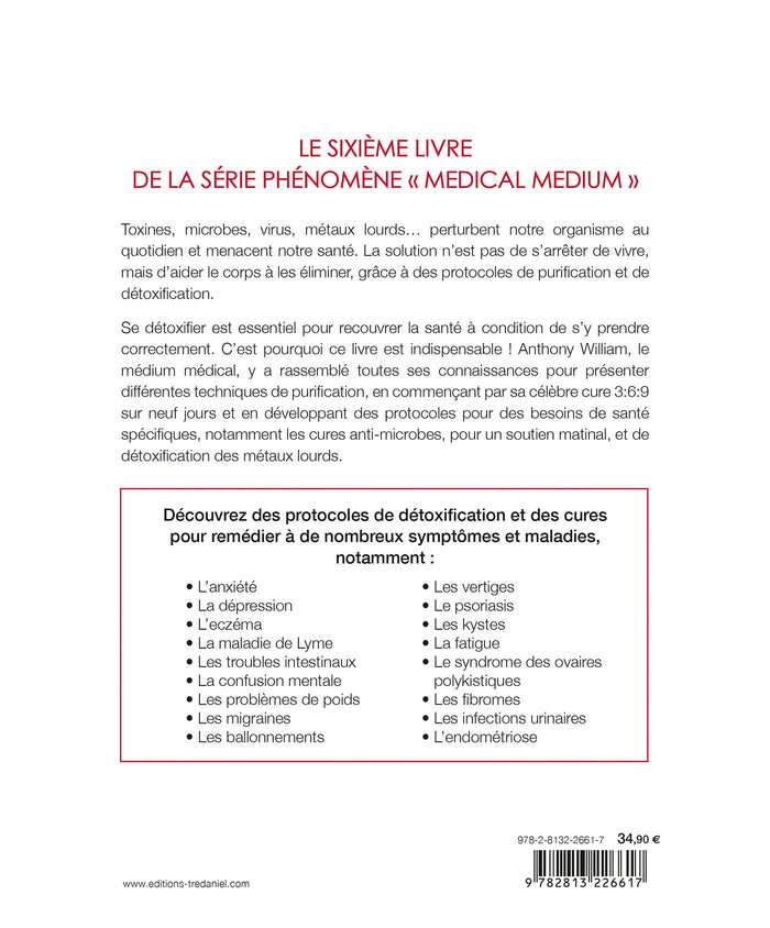 Dans ce sixième livre de la série 'Medical Medium', Anthony William, médium médical, propose des protocoles de purification pour éliminer toxines, virus, et métaux lourds. Il présente sa célèbre cure 3:6:9, des cures anti-microbes, et des détoxifications spécifiques. Les lecteurs y trouveront des solutions pour un large éventail de symptômes et maladies, allant de l'anxiété à l'endométriose en passant par la fatigue et les troubles intestinaux. Afficher moinsAfficher plus